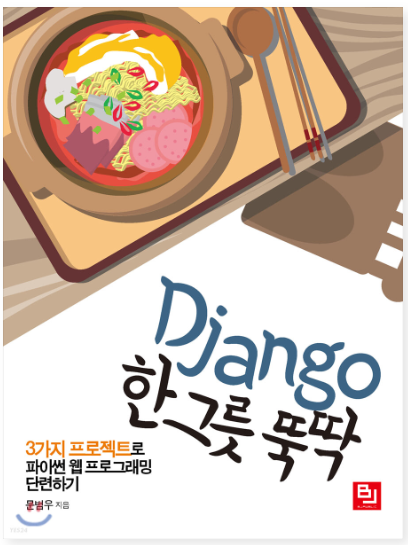 문범우 개발자님이 쓰신 'Django 한그릇 뚝딱'이라는 책입니다. 3가지 프로젝트를 자세한 설명과 함께 제시되어 있어서 코드를 입력하는 게 아직 어려운 분들께 많은 도움이 될 것이라고 생각합니다. (개발자님 감사합니다!!)