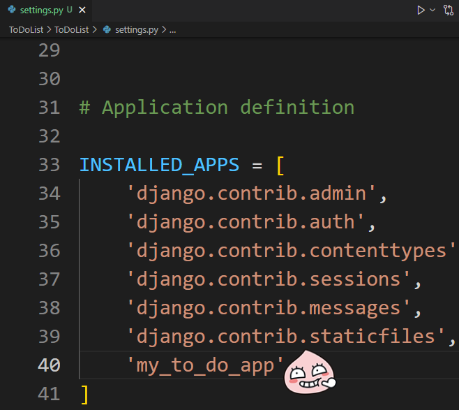 왼쪽 바에서 ToDoList > ToDoList > settings.py로 이동합니다. settings.py를 클릭하면 오른쪽에 탭이 만들어집니다.