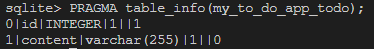 - PRAGMA table_info(my_to_do_app_todo); 를 입력하면 테이블의 정보를 볼 수 있습니다.