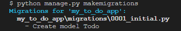 - 그럼 결과가 다음과 같이 나올 것입니다. 이렇게 우리는 Todo 라는 클래스를 생성했습니다. 그리고 my_to_do_app 폴더 안에 migrations 폴더가 생성되었고, 그 안에 0001_initial.py 파일이 생성되었습니다.