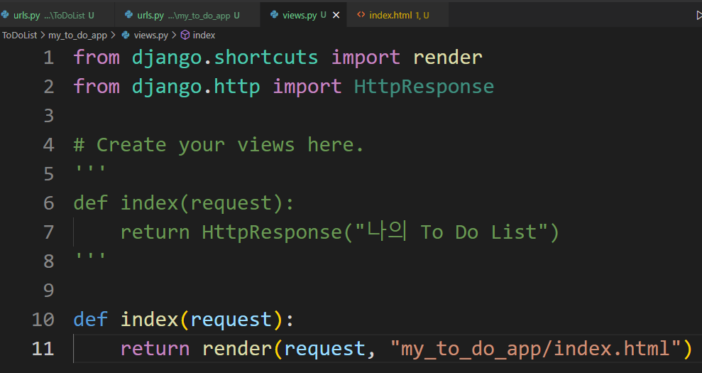그러기 위해서 우리는 어느 파일로 가야 할까요? 그렇죠, 구현되는 것과 관련된 views.py로 가서 코드 수정을 하겠습니다.