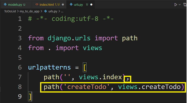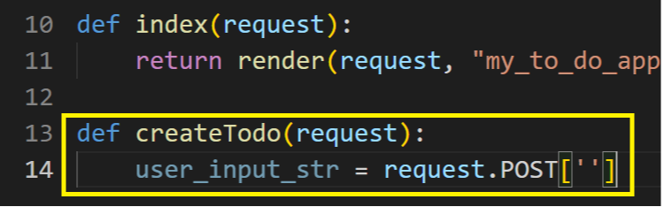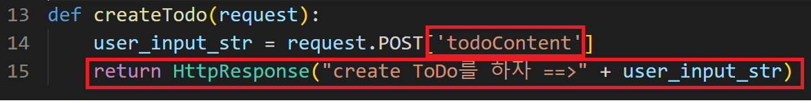- 이제 어디로 가야할까요? 위 8번째 줄의 의미는 저 url은 views의 createTodo에서 처리하라는 의미입니다. 그렇습니다. ToDoList > my_to_do_app > views.py 로 이동하고 다음과 같이 코드를 추가합니다.