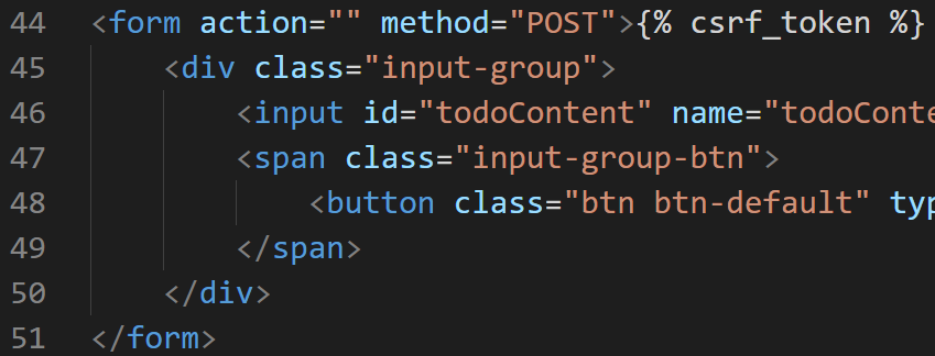 - 다시 ToDoList > my_to_do_app > templates > my_to_do_app > index.html 로 이동합니다. 46번째 줄에 todoContent라는 말이 보입니다. request에서 해당 name인 todoContent를 이용하여 해당 <input>태그 안에 있는 문자열을 받아올 수 있습니다.