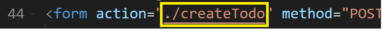 - <action>에 적어주는 경로로 데이터가 전달됩니다. 44번줄을 다음과 같이 수정합니다. 이렇게 수정을 하면, form안의 데이터가 createTodo라는 url로 전달된다는 것입니다.