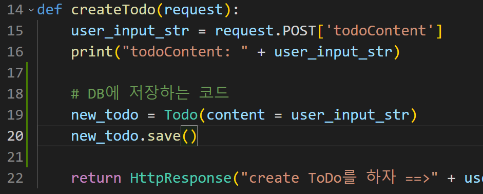 - 데이터베이스의 저장 로직은 views.py에서 시작합니다. 다음의 코드를 입력합니다.