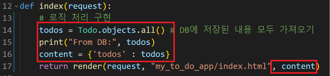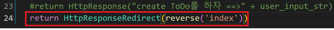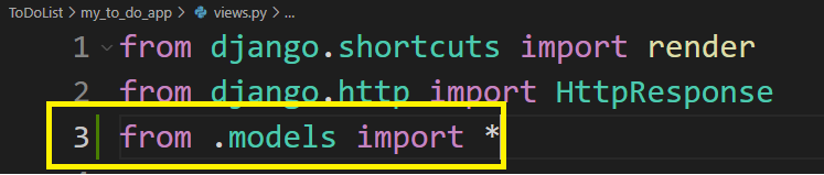 - ToDoList > my_to_do_app > views.py로 이동합니다. 다음과 같이 코드를 수정합니다.