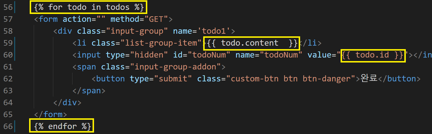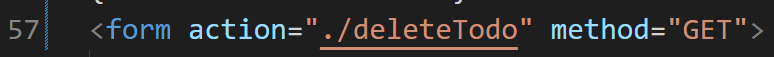 - 우선 index.html에서 사용자가 '완료'버튼을 눌렀을 때 /deleteTodo라는 url로 이동하도록 설정합니다.