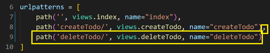 - 이젠 views.py로 가서 deleteTodo에 대해 정의하겠습니다. 다음의 코드를 추가합니다.