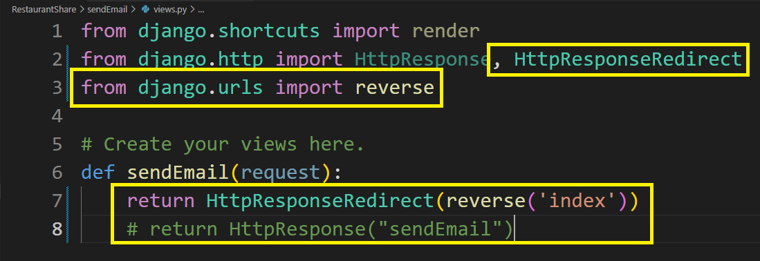 - RestaurantShare> sendEmail > views.py로 이동하여 코드를 수정합니다.