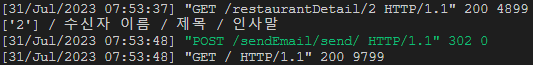 - 웹 페이지를 새로고침하고 '이메일 발송하기'를 클릭하면 다음과 같이 terminal창에 출력됩니다.