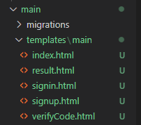 - 위의 코드에서 우리는 메인화면, 로그인, 회원가입, 인증코드 입력, 인증코드 확인, 결과 화면에 대한 url처리를 했습니다. 이제 view.py로 이동하여 각각에 해당하는 함수를 정의하겠습니다.
