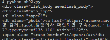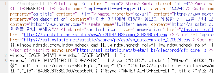 - 다음 코드는 웹 페이지의 html을 모두 불러오는 것입니다. 이는 우리가 웹 페이지에서 마우스 우클릭-페이지 소스코드 보기에서 확인할 수 있는 내용입니다.