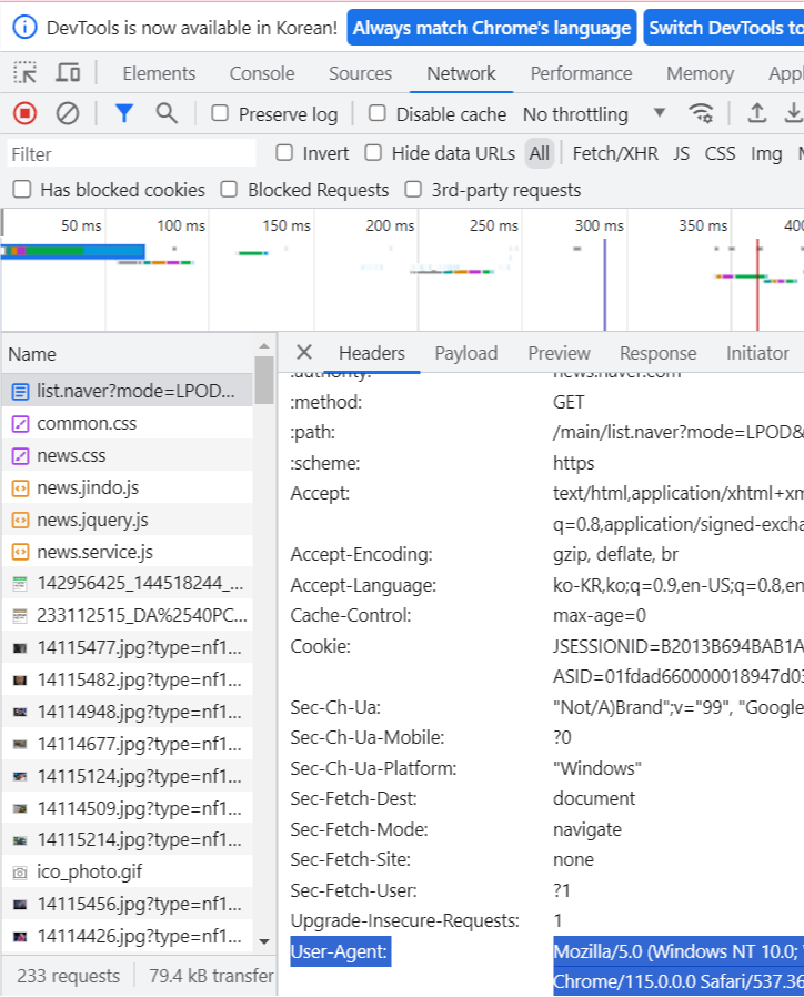 - 먼저 referer와 user-agent를 설정합니다. 이것은 [웹 페이지 마우스 우클릭- 검사 -네트워크- 파일 클릭 -requests headers 아래]에서 확인할 수 있습니다. referer는 해당 사이트 오기 직전의 사이트, user-agent는 브라우저 종류를 의미합니다.