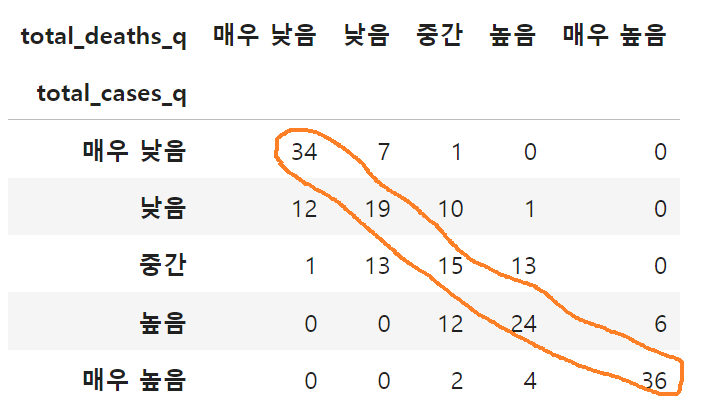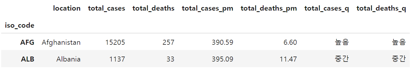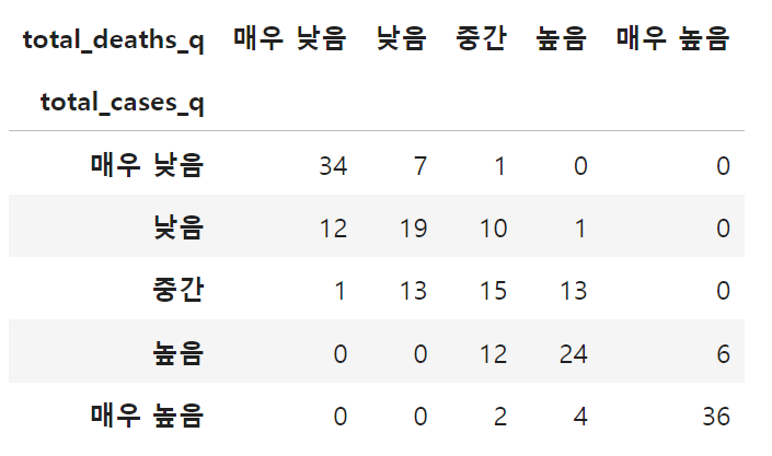 - 예를 들어 total_cases가 '낮음'이고 total_deaths가 '높음'인 한 국가가 어느 나라인지 다음의 코드로 찾을 수 있습니다.