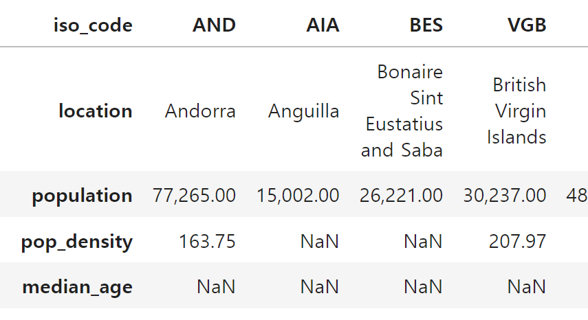 covidtotals.loc[demovars_misscnt >= 3, ['location'] + demovars].T # 행/열 뒤집기