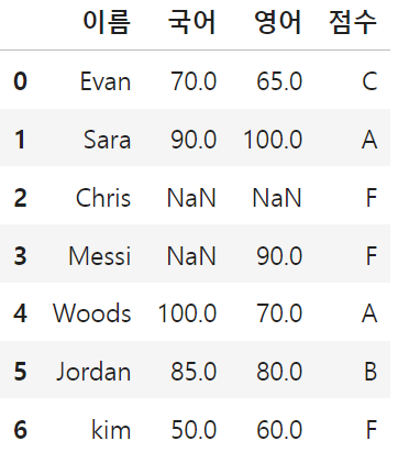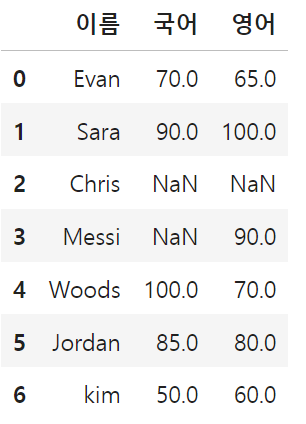 df.loc[6, "이름":"영어"] = ["kim", 50, 60]