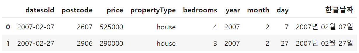 sales['한글날짜'] = sales['datesold'].dt.strftime('%Y년 %m월 %d일')