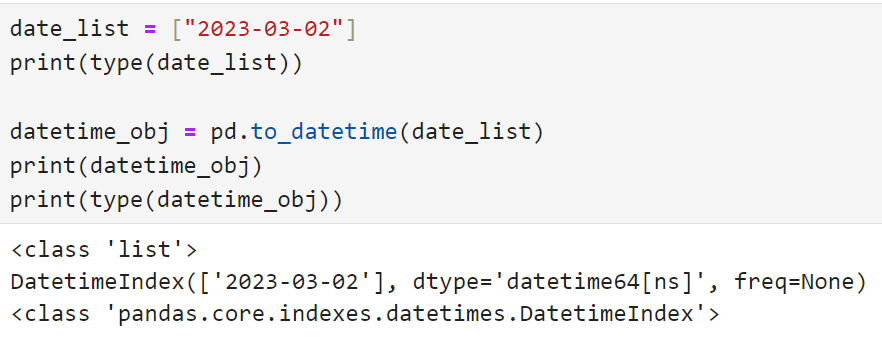 - 왼쪽 코드는 날짜가 str타입으로, 오른쪽 코드는 날짜가 list타입으로 입력되어 있습니다. 그리고나서 datetime으로 바꾸어보니 타입이 각각 timestamps, datetimeindex로 다르네요.