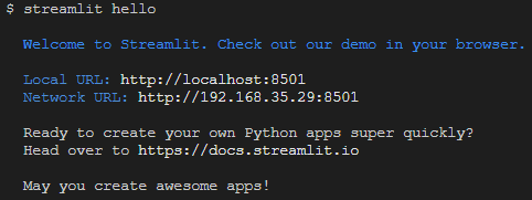 - terminal에 다음을 입력하여 Streamlit이 잘 작동하는 지 확인합니다.