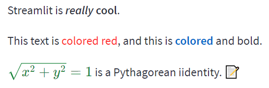 st.markdown(":green[$\sqrt{x^2+y^2}=1$] is a Pythagorean identity. :pencil:")