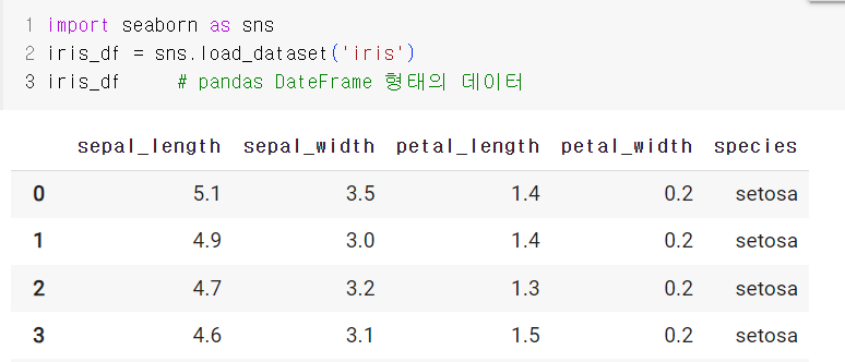 - 하지만 seaborn에서 불러오는 같은 붓꽃 데이터셋은 '문자형' 데이터도 함께 있죠.