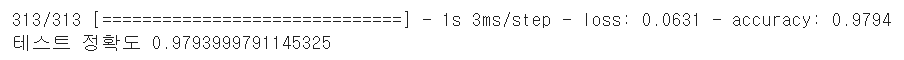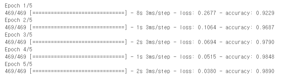 - 훈련 데이터에 대한 모델의 손실과 정확도가 출력이 되었습니다.