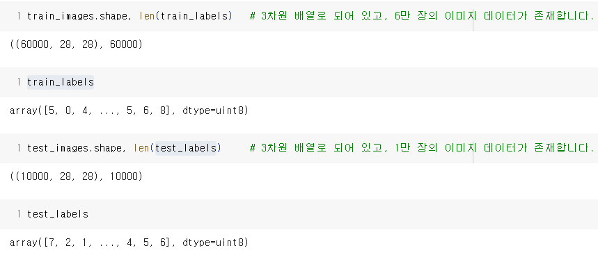 - 데이터의 형태를 확인해보면, 훈련 데이터는 3차원 배열에 6만 장의 이미지 데이터가 있습니다.