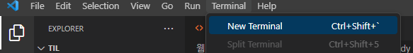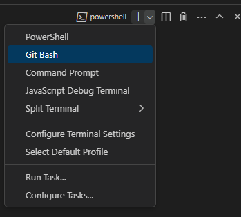 2. 터미널 창 오른쪽에 메뉴를 클릭하여 git bash모드로 바꿔줍니다.