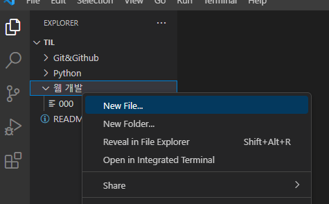 2. 실습 폴더와 파일을 만듭니다. 마우스 우클릭을 하면 만들 수 있습니다.