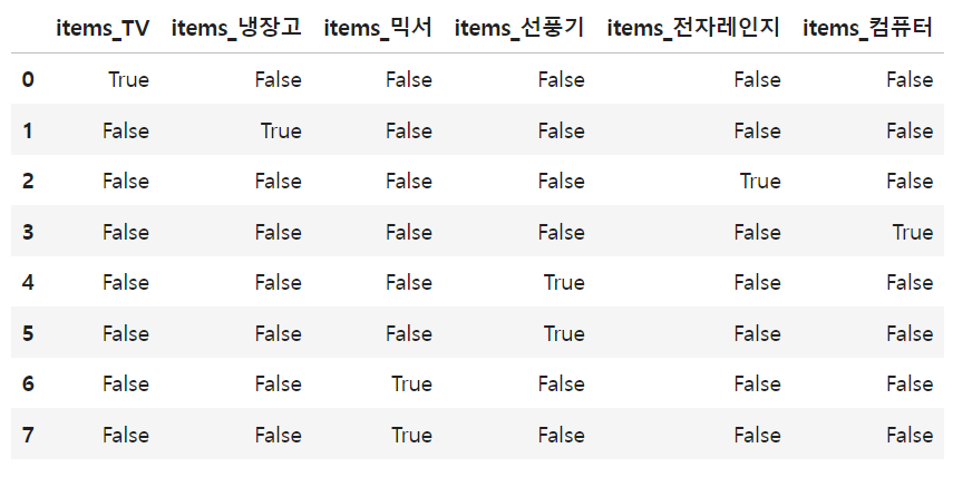 df = pd.DataFrame({'items' : ['TV', '냉장고', '전자레인지', '컴퓨터', '선풍기', '선풍기', '믹서', '믹서']})