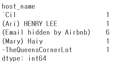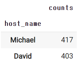 - 각 host_name의 빈도수를 구하고 빈도수 기준 내림차순 정렬한 데이터 프레임 만들기. 빈도수 컬럼은 counts.