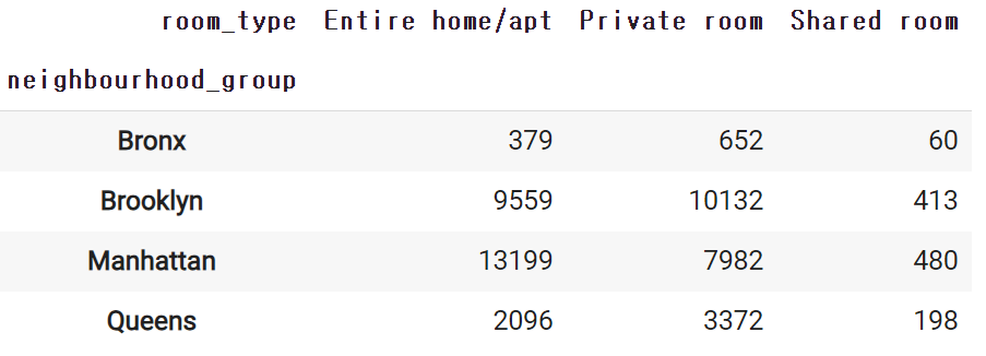 - unstack()을 하니 room_type의 하위 항목이 세로 줄로 옵니다.
