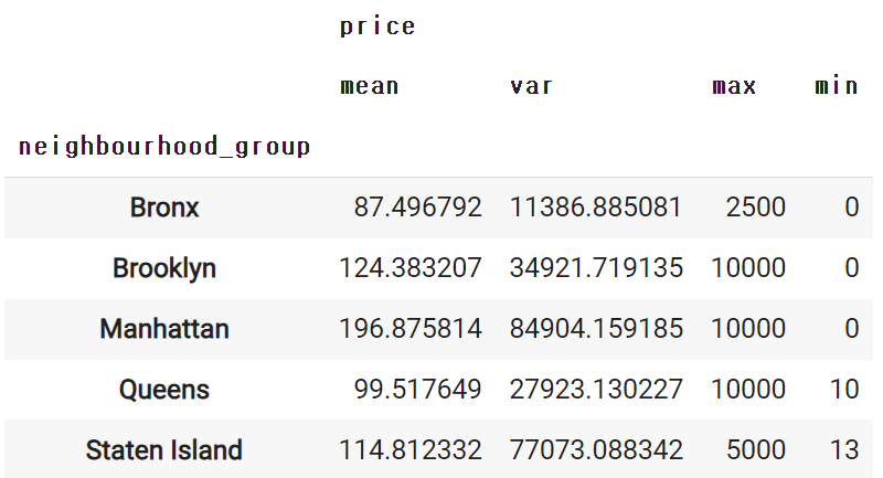 - neighbourhood_group 값에 따른 price의 평균, 분산, 최대, 최솟값 구하기