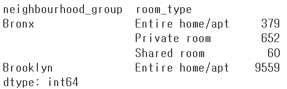 df[['neighbourhood_group', 'room_type']].groupby(['neighbourhood_group', 'room_type']).size()