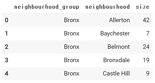 df.groupby(['neighbourhood_group', 'neighbourhood'], as_index=False).size()\