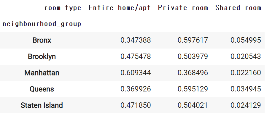 - neighbourhood_group 값에 따른 room_type 컬럼의 숫자를 구하고 neighbourhood_group 값을 기준으로 각 값의 비율 구하기