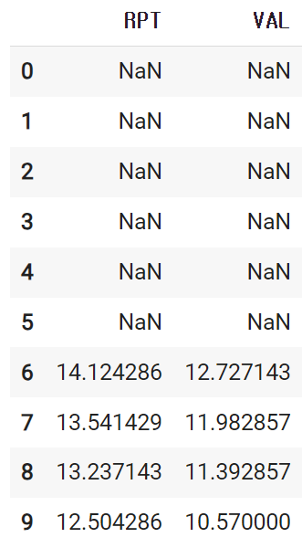 - RPT와 VAL의 컬럼을 일주일 간격으로 각각 이동평균한 값 구하기