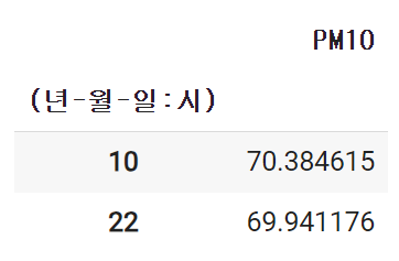 - 오전 10시와 오후 10시(22시)의 PM10의 평균값 구하기