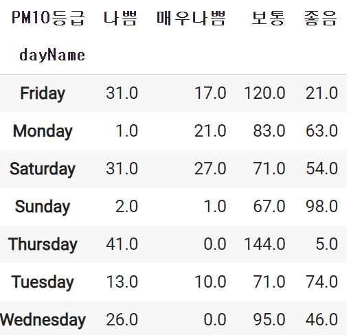 data2 = data1.pivot(index='dayName', columns= 'PM10등급', values = 'size').fillna(0)