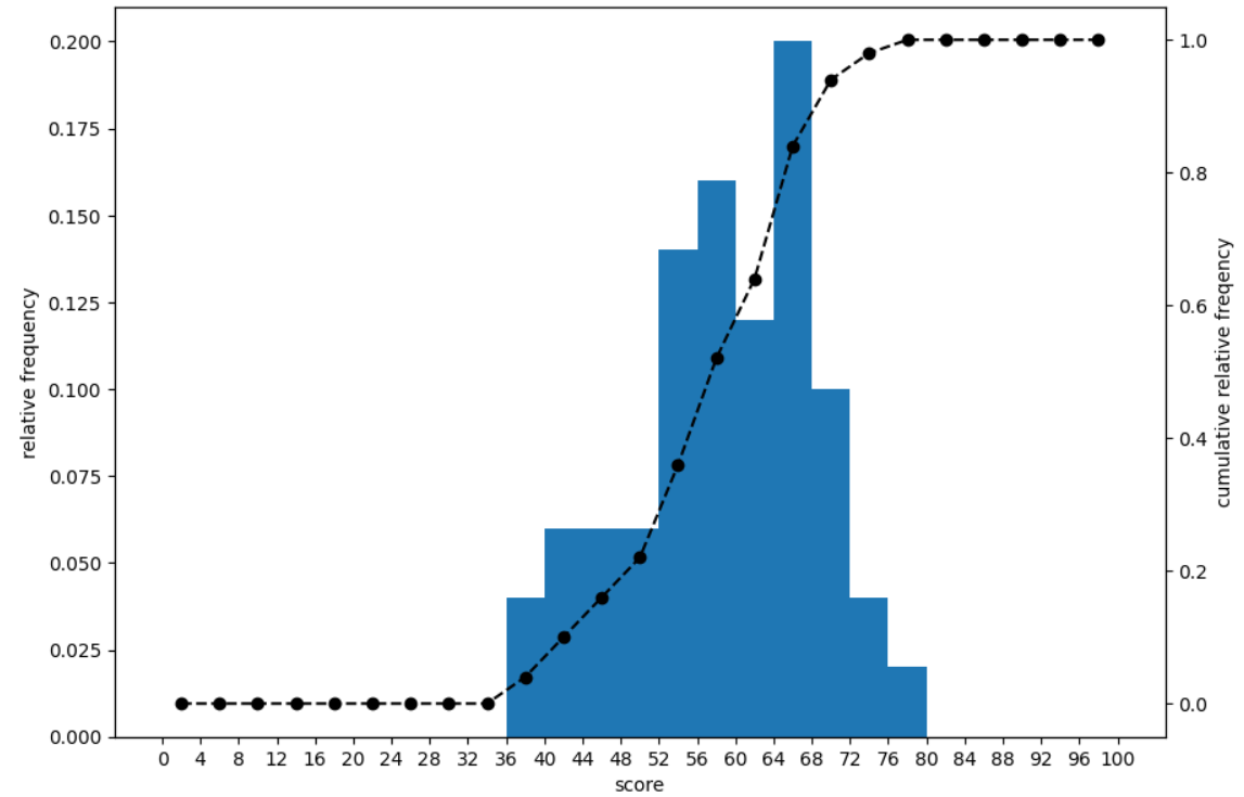 - 이번에는 상대도수의 히스토그램을 누적상대도수의 꺾은선 그래프와 함께 그리겠습니다.